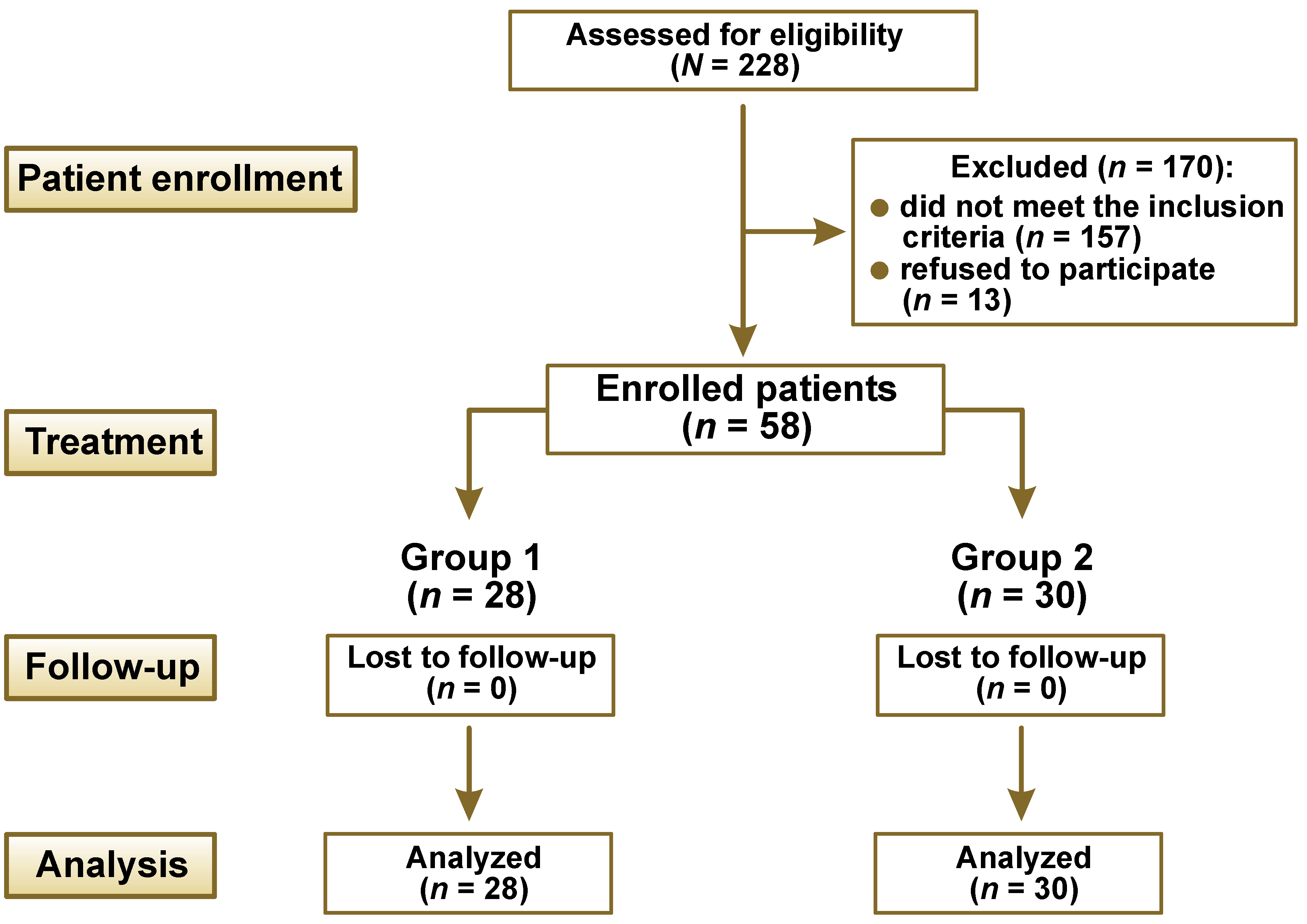 Patients were randomly allocated according to the random number table, employing the blocking type method with a block size of 4 and a range of numbers from 1 to 100. The table was designed by one of the researchers (MSki), who was not initially aware of the clinical trial design. After randomization, the sample comprised 12 male and 16 female subjects in the 1st group, and 16 male and 14 female participants in the 2nd group.