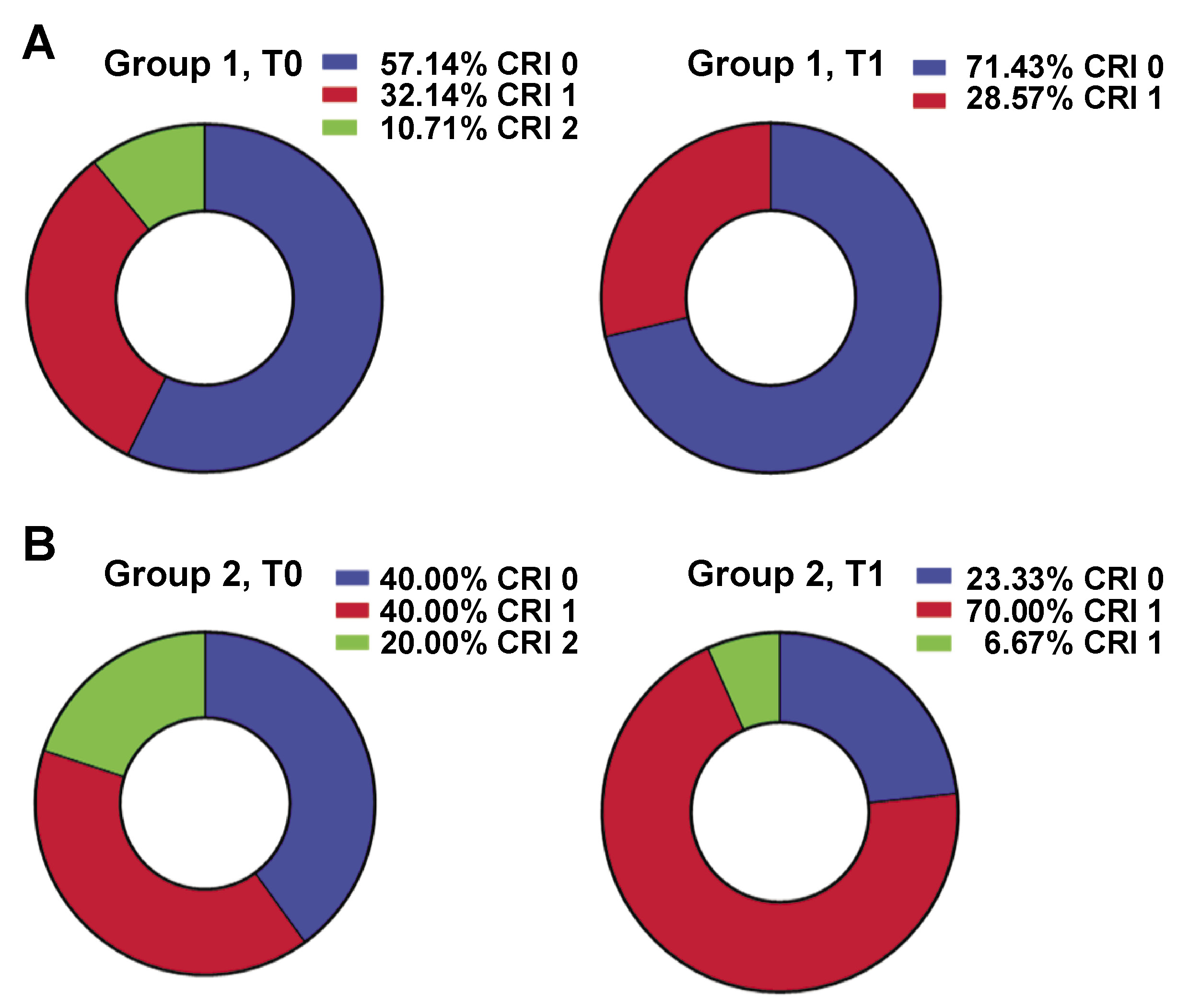 Before treatment (T0), CRI values of 1 and 0 prevailed in both groups (Figure 2). After treatment (T1), the majority of patients in group 1 exhibited CRI of 0 (71.43%), while the remaining individuals demonstrated CRI of 1 (Figure 2A). However, in group 2, the value of 1 was predominant (70.00%) after treatment, with CRI of 0 being observed in 23.33% of the participants (Figure 2B). Before treatment, AI and AN in the first group were 18.25 ±14.81 and 67.00 ±31.65, respectively, and in the second group, 19.54 ±12.53 and 64.67 ±32.81, respectively. After the treatment, a statistically significant change in AN was observed in both groups (38.96 ±37.98 and 39.23 ±33.63 in group 1 and 2, respectively; p < 0.01). However, changes in AI were not significant (17.46 ±14.09 and 23.21 ±19.33, respectively). After treatment (T1), no differences in AI and AN were noted between the 2 groups.