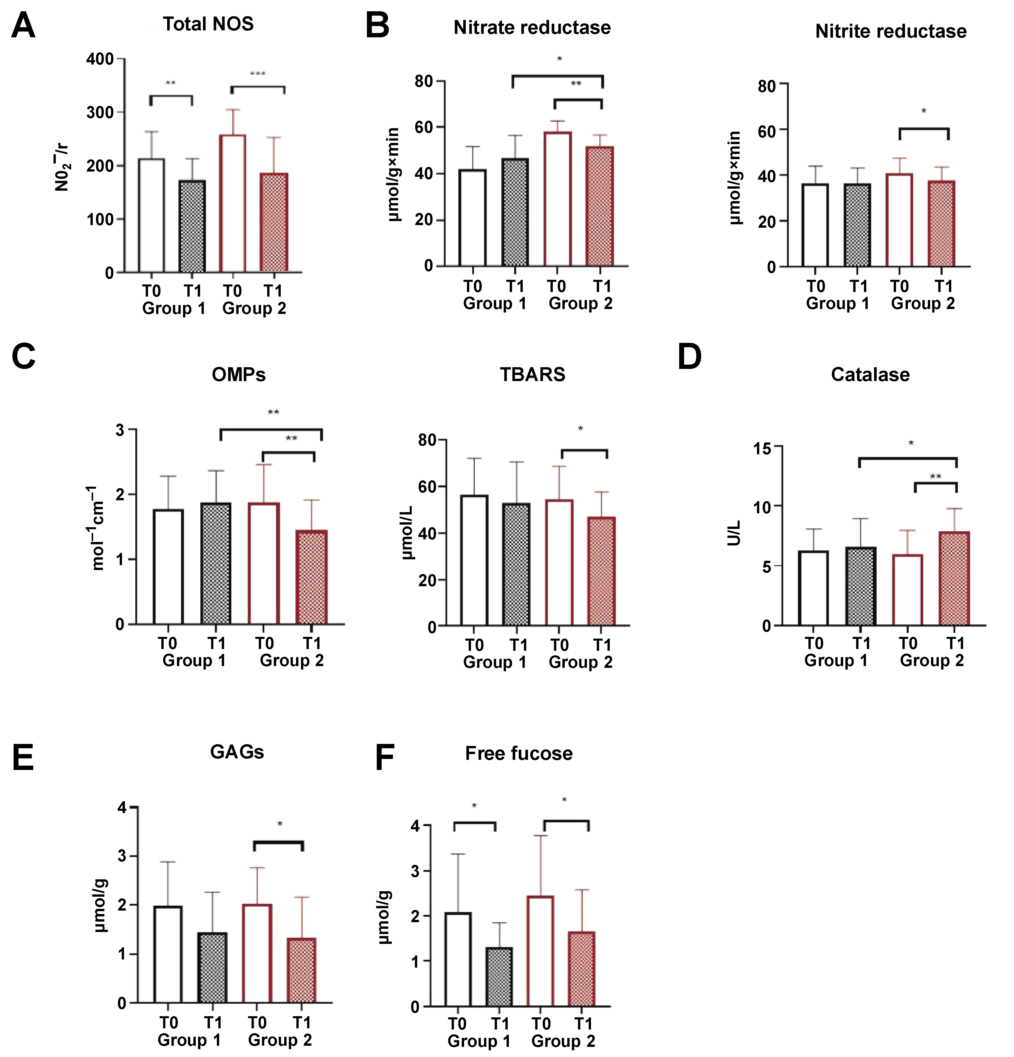 In both groups, treatment resulted in a significant decrease in total NOS activity and free fucose concentration (Figure 3A,F). There was no change in the levels of salivary α-amylase activity, total proteolytic activity and proteinase inhibitors, as well as the concentration of nitrites and nitrates in saliva (supplementary materials – available on request from the corresponding author). In the saliva of the patients from group 2, a slight yet significant decrease in nitrate and nitrite reductase was observed (Figure 3B). A significant reduction in markers of oxidative stress, such as OMPs and TBARS, and an increase in catalase activity was detected in group 2 (Figure 3C). A significant decline in GAG concentration was documented in group 2; however, a tendency toward a decrease in GAG concentration was also observed in group 1 (Figure 3D).