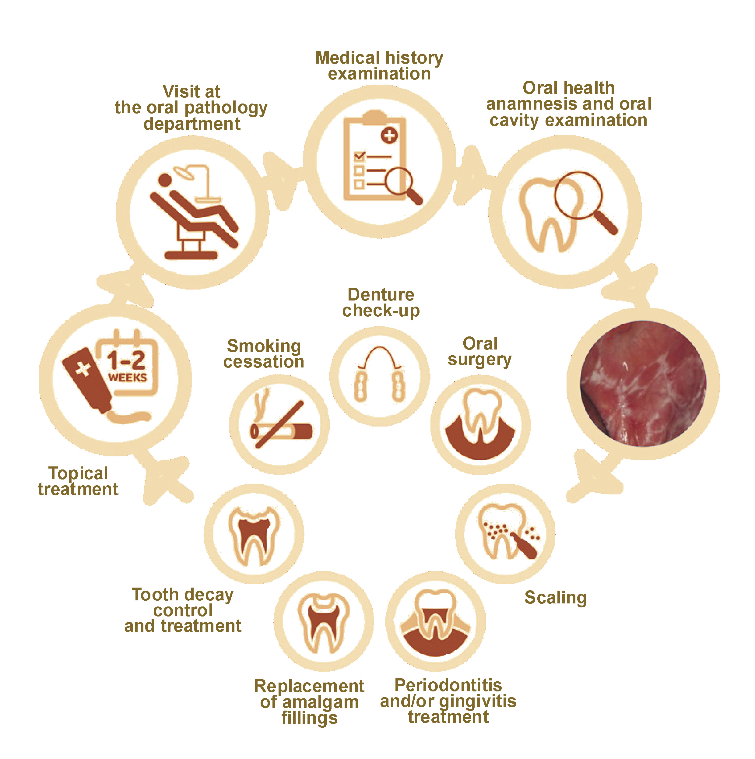 Oral lichen planus (OLP) is a chronic inflammatory T-cell-mediated disease classified by the World Health Organization (WHO) as an oral potentially malignant disorder (OPMD), with an overall incidence of 0.49–1.43% in the general population.1 Oral lichen planus is a chronic condition2, 3, 4 that is not related to tobacco smoking or betel chewing, two widely discussed risk factors for OPMDs.5 The possible association of hormonal changes with the development of OLP has been suggested since the disorder exhibited an increased incidence in post- and peri-menopausal non-smoking and non-alcohol-drinking women.6, 7, 8 Other causal links for OLP formation include diabetes mellitus, infection with the hepatitis C virus (HCV) and stress.6, 7 The clinical management of OLP is of great importance, as there are no established programs for primary prevention beyond the avoidance of tobacco and the cessation of alcohol consumption.2, 9 Despite the considerable interest in the influence of different viral infections on OPMDs, it has not been conclusively defined how the presence of different human papillomaviruses (HPVs) affects OLP patients and influences the eventual progression to oral squamous cell carcinoma (OSCC). The diagnostic process of OLP in the dental office is presented in Figure 1.