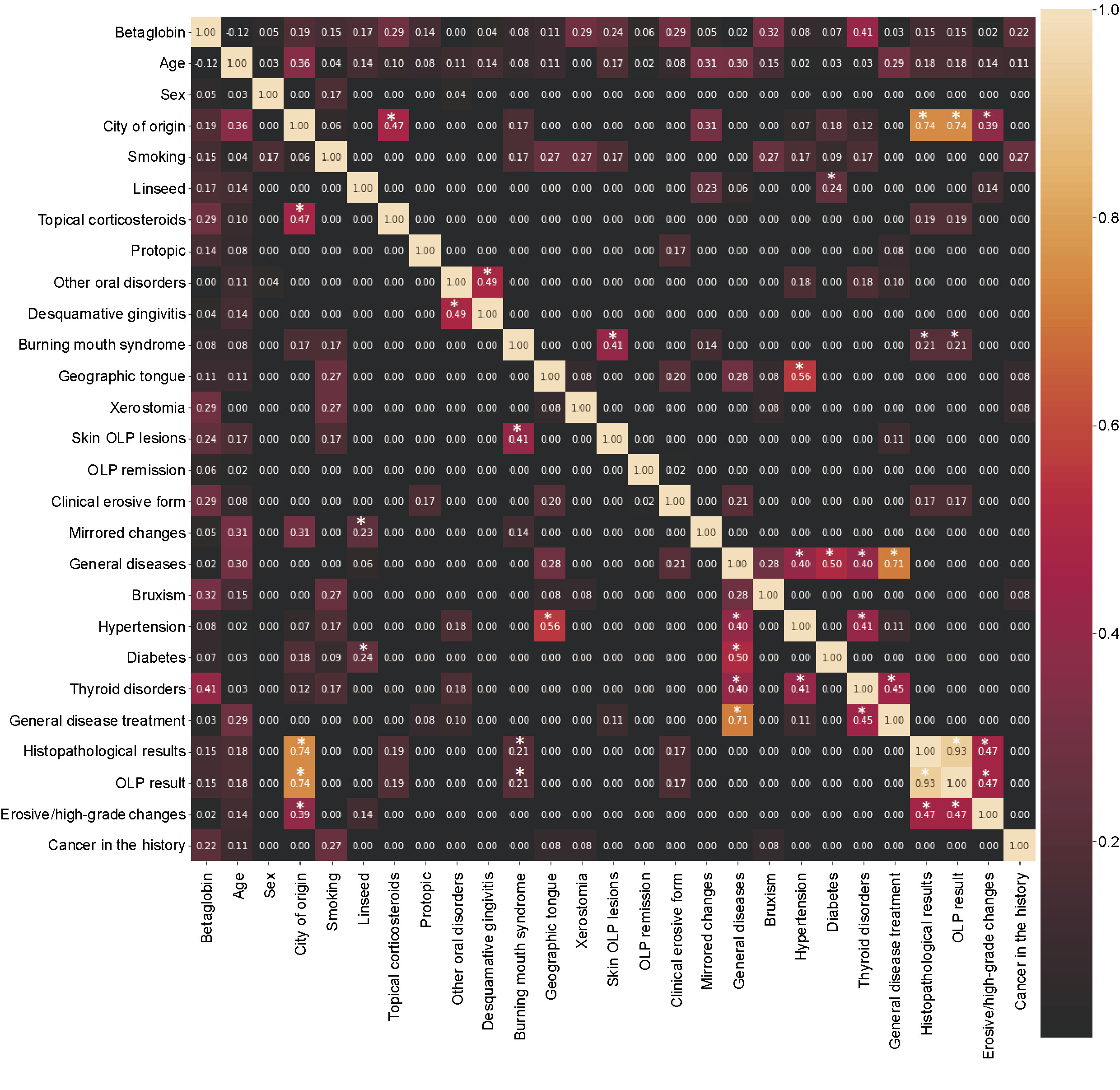 Additionally, the relationships between questionnaire variables are presented in Figure 2. A marked relationship was identified between hypertension and geographic tongue, as well as between the manifestation of skin OLP and the presence of burning mouth syndrome in individuals with OLP.