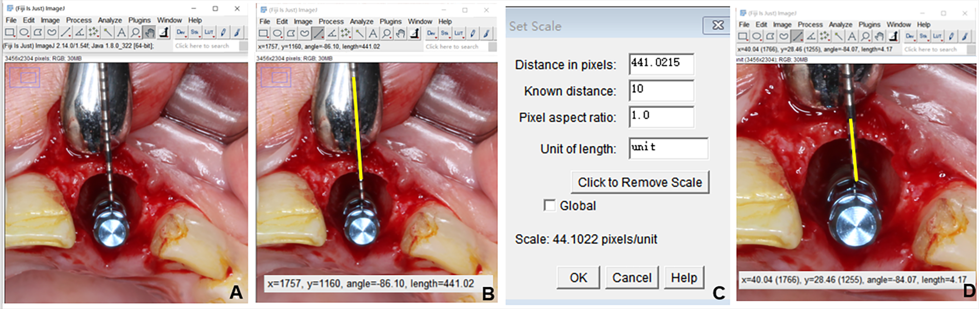The distance from the labial bone surface at the bone crest level to the implant neck was measured intraoperatively using a standard periodontal probe. To ensure measurement accuracy, the probe was calibrated with the same steel ruler before each use. Photographs were then taken and the corresponding distance in the images was measured using the ImageJ software (https://imagej.net/ij), as shown in Figure 2. All measurements were independently performed by 2 trained assessors to minimize the observer bias.