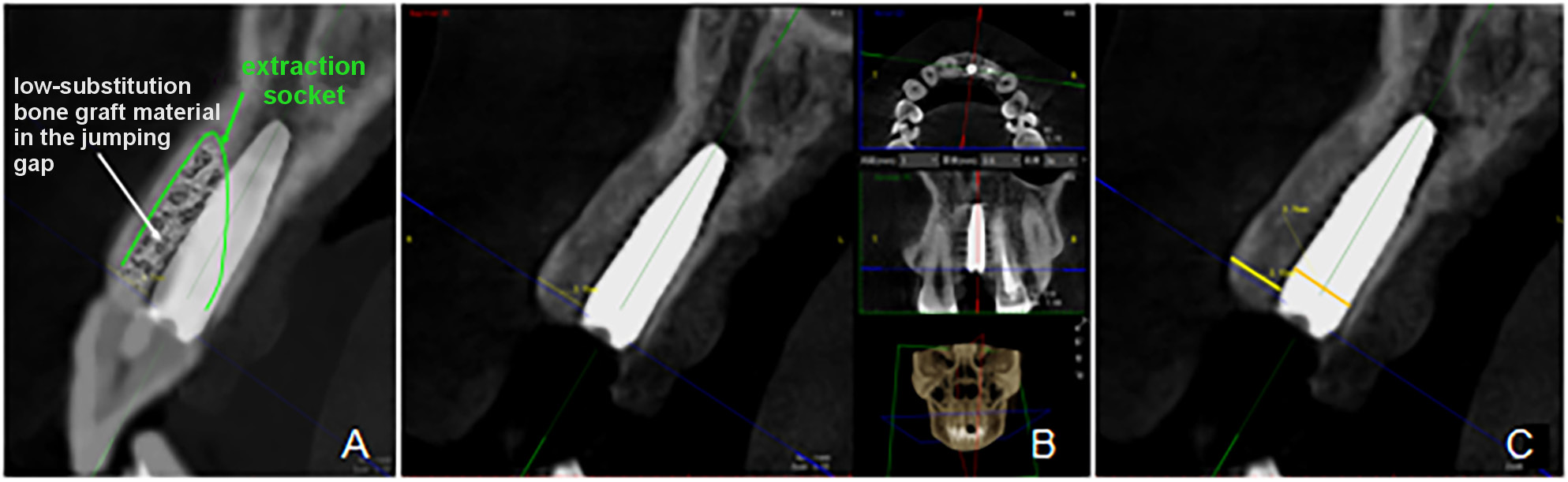 Intraoperative measurements were obtained using a periodontal probe and documented with photographs. Bio-Oss® Collagen (Geistlich Pharma, Wolhusen, Switzerland) was compactly placed into the jumping gap. A CBCT scan (ProMax® 3D; 96 kV, 5.6 mA, exposure time: 12.094 s, voxel size: 0.2 mm; field of view (FOV): 13.0 cm × 9.0 cm; Planmeca, Helsinki, Finland) was performed immediately after implant placement.