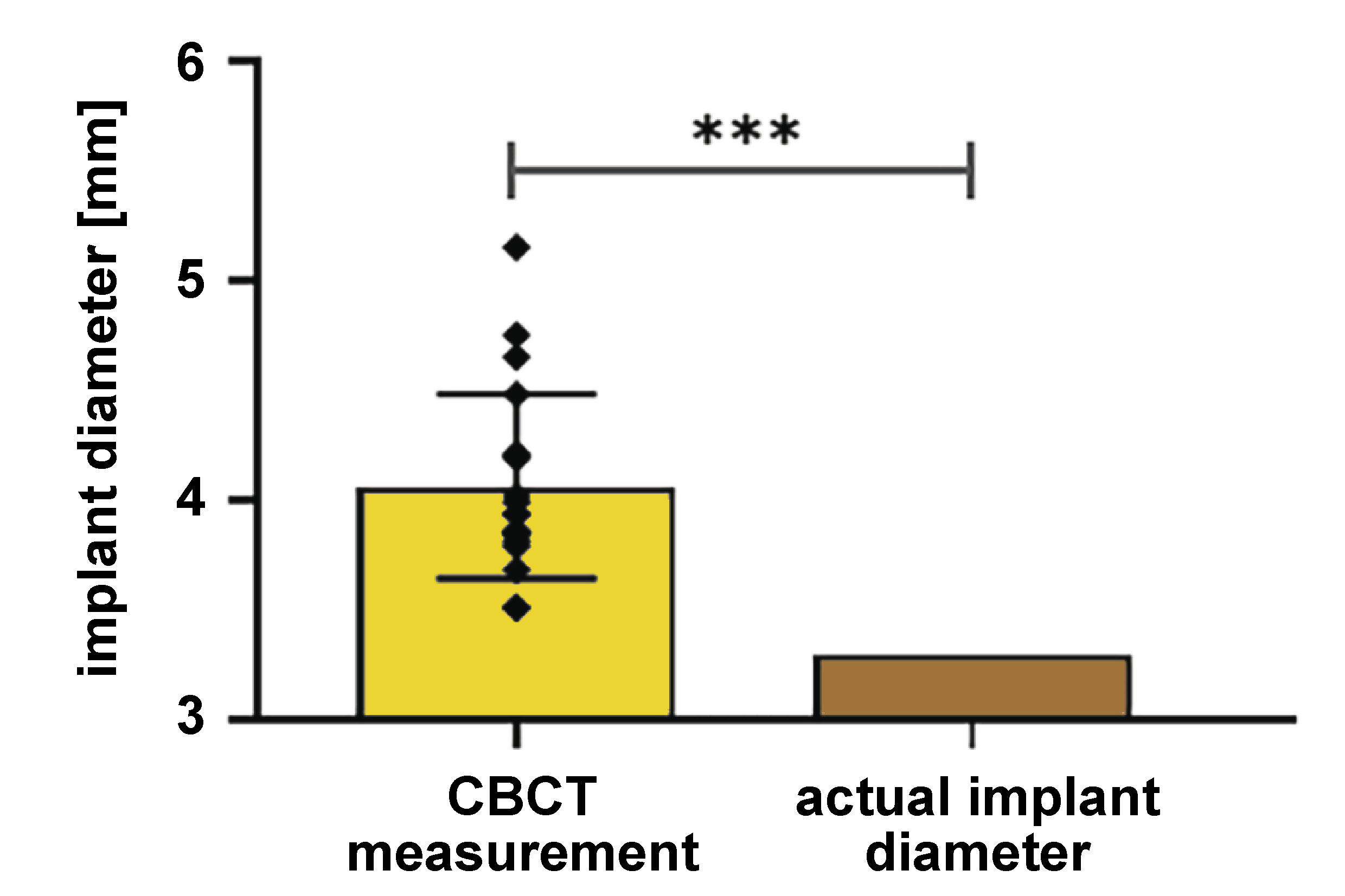 The mean diameter of the 20 implants measured by CBCT was 4.1 ±0.4 mm. The actual diameter of the implant was 3.3 mm. There was a statistically significant difference (t = 8.17; p < 0.001) between the diameters measured in the CBCT images and the actual value. The results are presented in Figure 5.