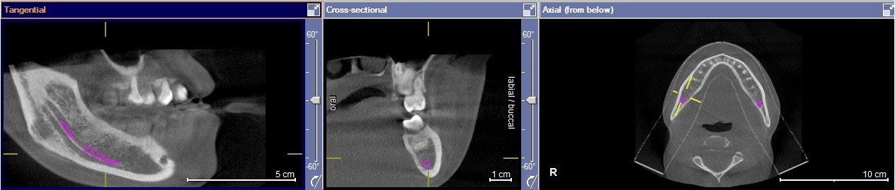 The CBCT images were evaluated independently by a radiologist and an endodontist, each with at least 5 years of clinical experience. The course of MC was manually delineated, and measurements were performed by both examiners. As the diameter of MC may vary, the software canal-marking tool, which applies a fixed diameter, was used for all CBCT examinations to ensure standardization. The same CBCT unit and software system were used throughout the study.