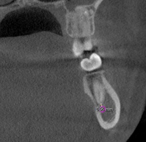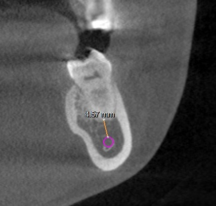 All molar teeth were evaluated in 3 planes (sagittal, axial and coronal) to determine the shortest linear distance between the root apex and the superior cortical border of MC (Figure 1). Distances <1.00 mm were classified as very close to MC (Figure 2).28 Distances ≥1.00 mm were considered distant from MC (Figure 3).28 When the root apex was in intimate contact with or invading MC, the distance was recorded as 0 mm (Figure 4).