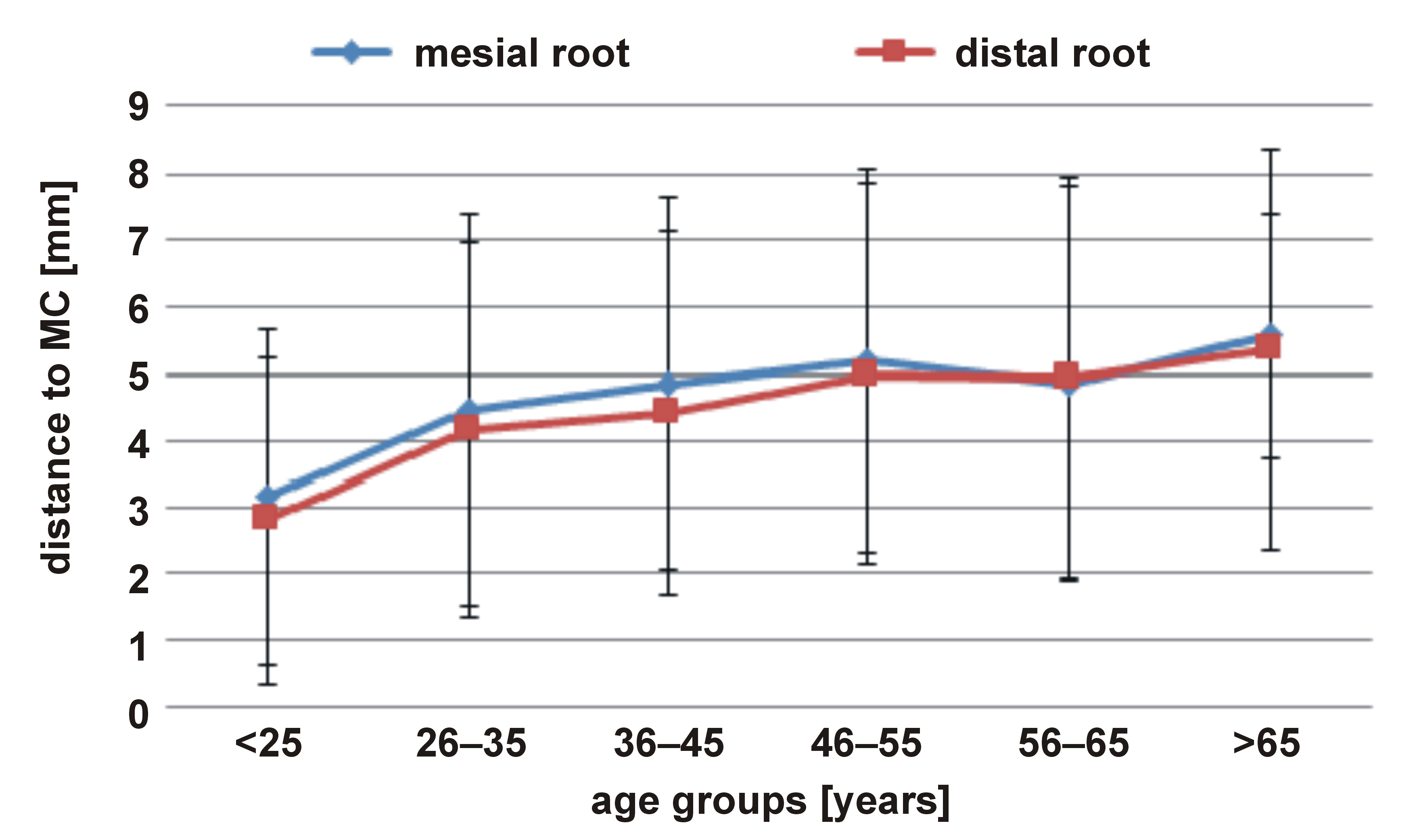 In terms of the mean distance, mesial and distal roots were closer to MC in the 18–25-year age group as compared to other age groups (p < 0.05). Mesial roots in the 26–35-year age group were significantly closer to MC than in the 46–55-year age group (p < 0.05). Similarly, distal roots in the 26–35-year age group were significantly closer to MC than in the 46–55- and 56–65-year age groups (p < 0.05). In addition, in terms of both mesial and distal roots, the mean distance in the 36–45-year age group was significantly shorter as compared to the 46–55-year age group (p < 0.05) (Table 2, Figure 5). With respect to sex, both mesial and distal root apices were significantly closer to MC in females than in males (p < 0.05) (Table 2).