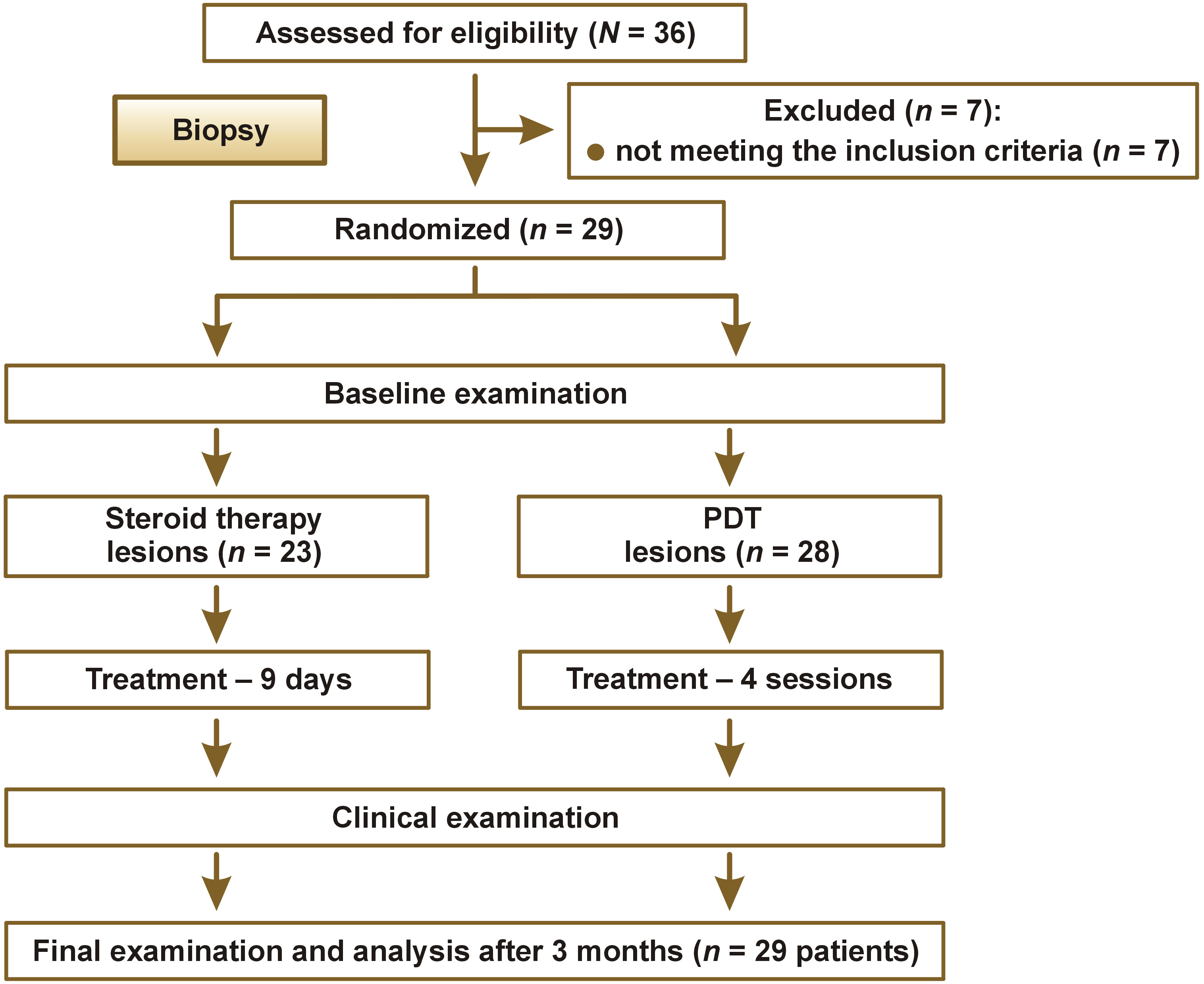 A total of 29 patients participated in the study. Patients with bilateral erythematous or erosive OLP lesions larger than 1 cm in diameter, confirmed histopathologically at the Department of Clinical Pathology of Wroclaw Medical University, were included in the study. The qualification process and assignment of numbers from 1 to 29 were conducted by the same physician (TPK). The main exclusion criterion was dysplasia identified in the histopathological examination. Other exclusion criteria included diabetes, liver diseases, smoking (including e-cigarettes with nicotine), pregnancy, or the objective determination of a lichen planus-like nature of the lesions. The clinical assessment of the evolution of OLP lesions was performed at baseline, at the end of both forms of treatment (day 12) and after 12 weeks without treatment. Patient workflow is presented in Figure 2.