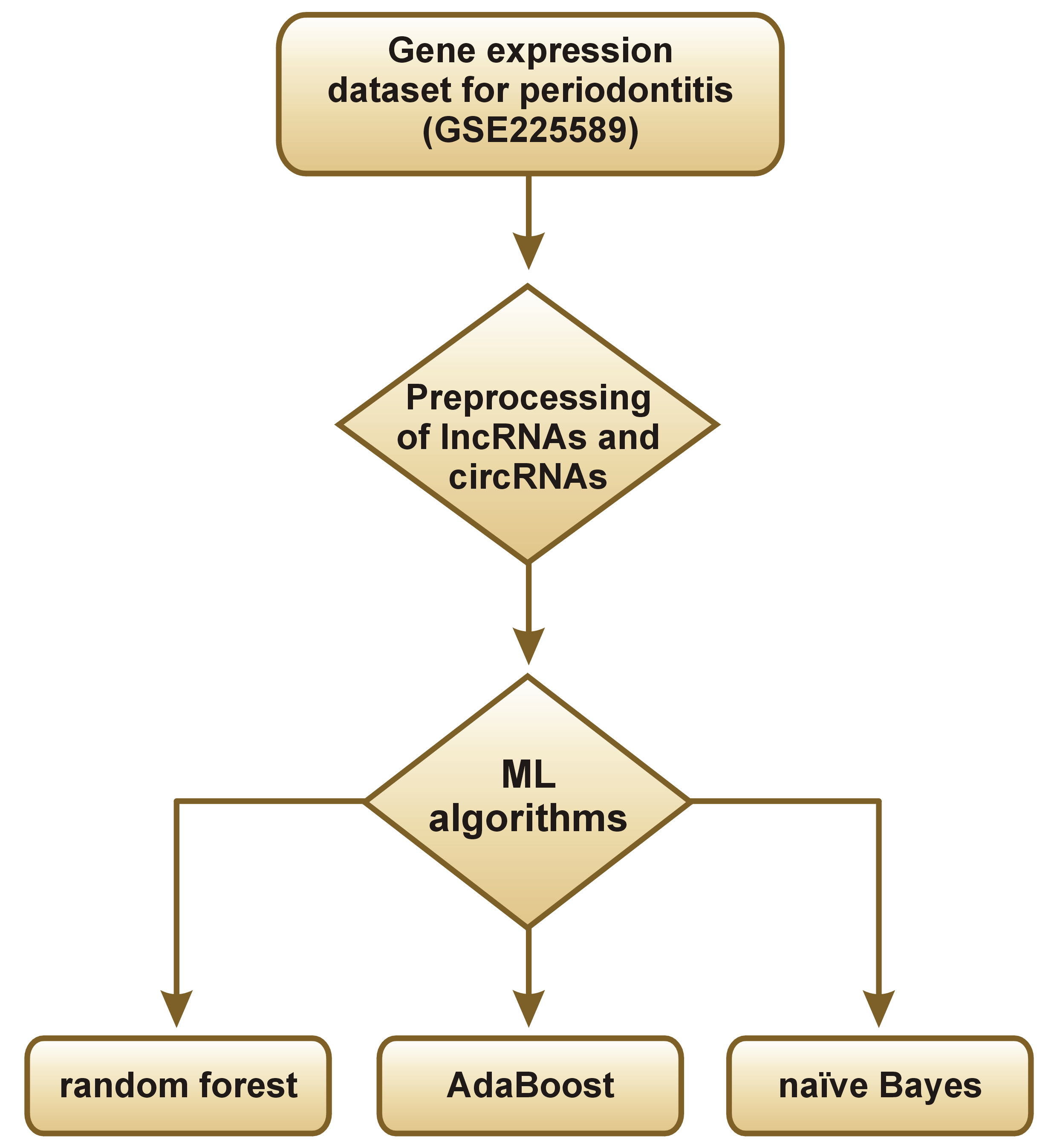 Material and methods. Long non-coding RNAs (lncRNAs) and circular RNAs (circRNAs) were identified from the periodontitis gene expression dataset (GSE225589) obtained from the Gene Expression Omnibus (GEO) database and subsequently preprocessed. Long non-coding RNAs and circRNAs were labeled based on the gene expression. Transcriptomic features were analyzed using 3 ML algorithms: random forest (RF); adaptive boosting (AdaBoost); and naïve Bayes (NB). The dataset was labeled and divided into training (80%) and testing (20%) subsets with cross-validation. Additionally, receiver operating characteristic (ROC) curves, confusion matrices and area under the ROC curve (AUC) values were determined.