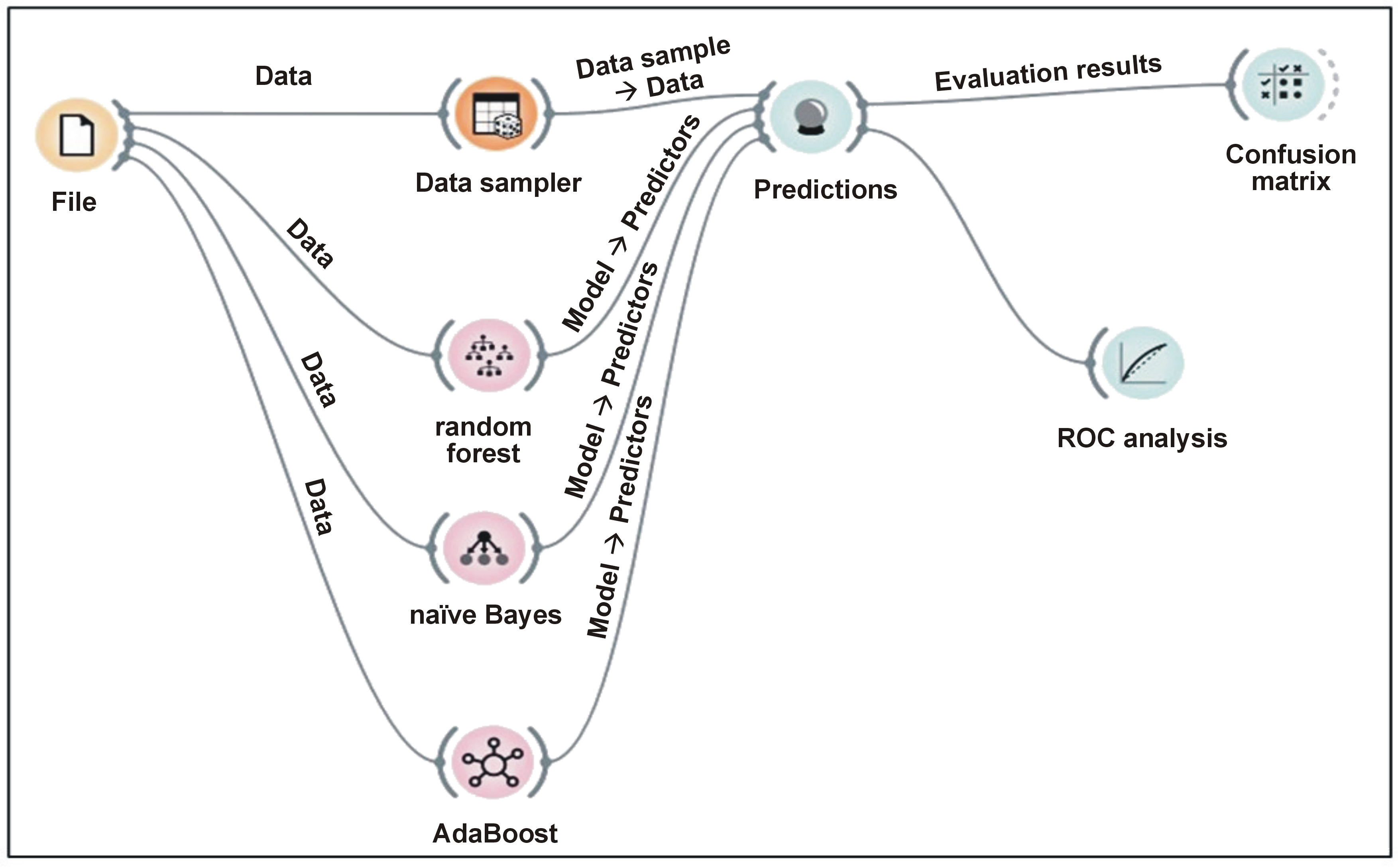 In the present study, we aimed to predict ncRNAs associated with F. nucleatum infection in mice to better understand the etiology of F. nucleatum-related disorders. Orange, an open-source data visualization and ML toolkit developed in Python, has been used to build and analyze predictive models. The tool supports popular algorithms like RF, neural networks, AdaBoost, NB, and logistic regression, but in our study, 3 models were used: RF; AdaBoost; and NB.
