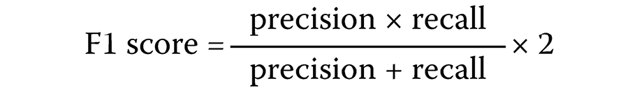 To jointly evaluate precision and recall, the F1 score was calculated (Equation 5):