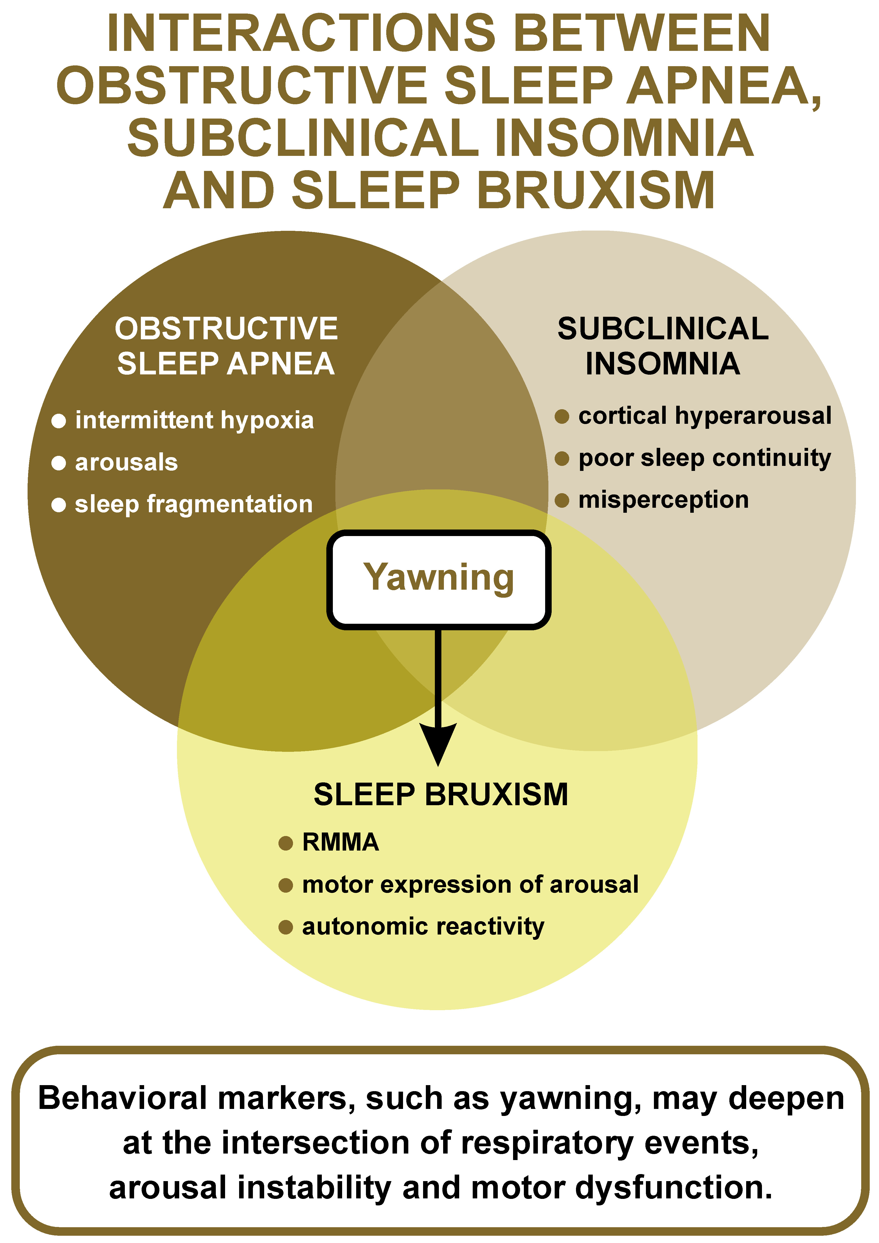 As illustrated in Figure 1, yawning may emerge at the intersection of OSA, subclinical insomnia and SB, reflecting shared arousal-related mechanisms. Nocturnal yawning might serve as a clinical clue, albeit subtle and unspecific, of latent COMISA physiology, especially in patients who otherwise present a predominantly respiratory sleep disorder phenotype. Such behavioral markers may reflect deeper layers of arousal instability and neurochemical dysregulation that are not easily captured by conventional sleep diagnostics.