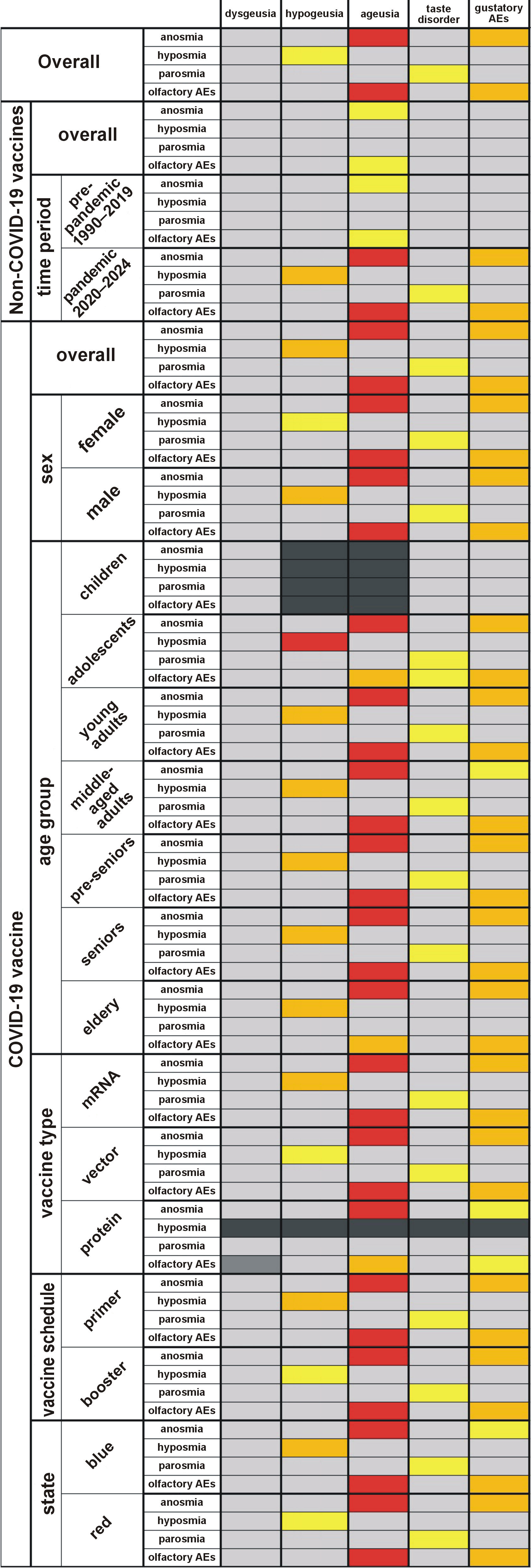 Sensitivity analyses confirmed that females exhibited a greater number of SDRs (32/39) than males (21/39). Middle-aged adults showed the highest number of true SDRs, whereas children (<5 years) and the elderly (≥80 years) exhibited the fewest. Non-severe (30/39), non-hospitalized (34/39) and non-fatal (36/39) cases accounted for substantially more SDRs than severe (8/39), hospitalized (2/39) and fatal cases (0/39). The mRNA-based (35/39) and viral vector-based (25/39) vaccines were associated with more SDRs than protein subunit COVID-19 vaccines (6/39) and influenza vaccines (0/39). Co-occurrence analyses demonstrated moderate agreement between gustatory and olfactory AEs (κ = 0.459), which increased for non-COVID-19 vaccines during the pandemic (κ = 0.500) compared with the pre-pandemic period (κ = 0.115). This pattern suggests the presence of notoriety bias rather than a causal association with COVID-19 vaccines.