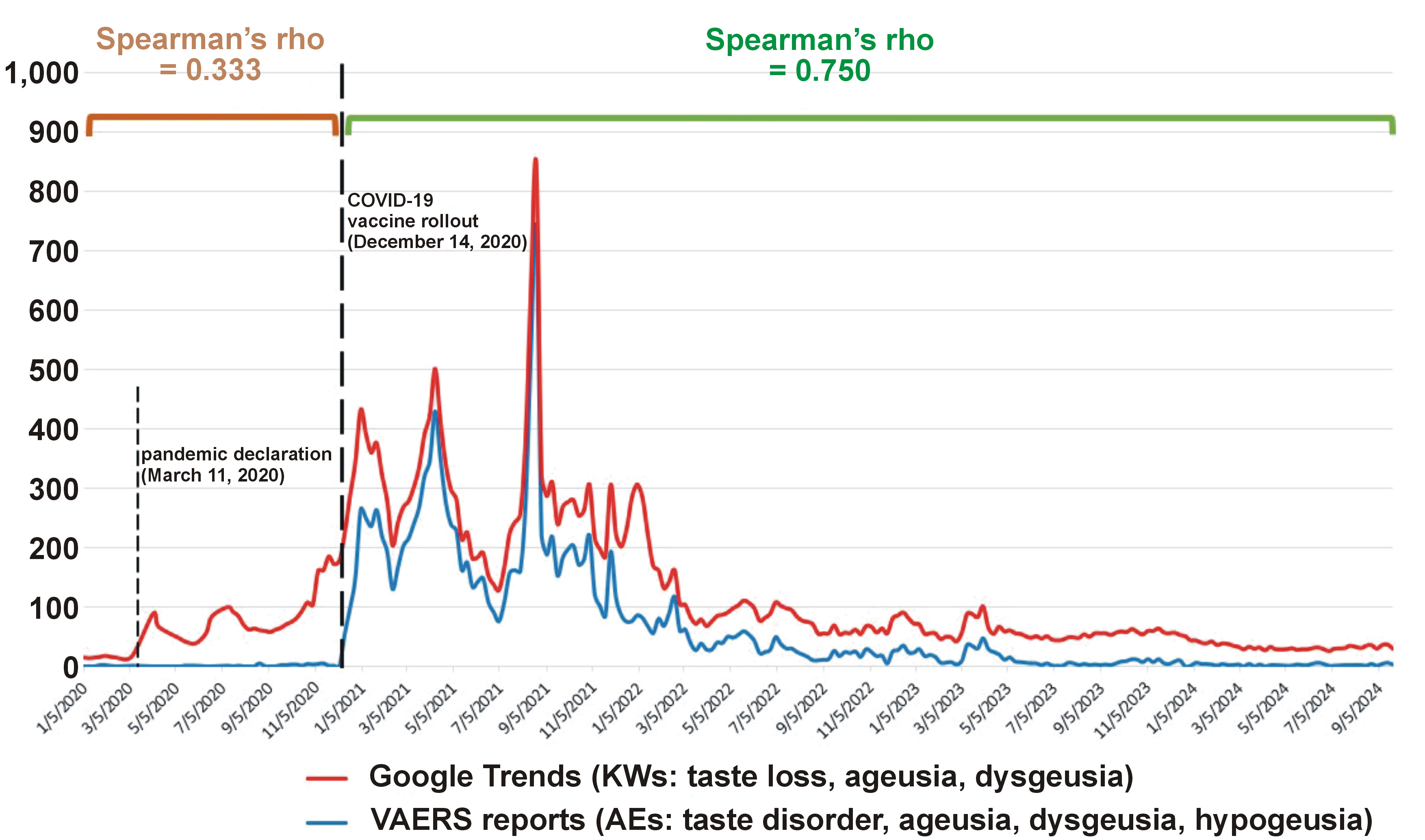 A non-parametric correlation analysis was performed between the weekly search volume of keywords (taste loss, ageusia and dysgeusia) in Google Trends (https://trends.google.com/trends) and the weekly number of gustatory AE reports in VAERS (taste disorder, ageusia, dysgeusia, and hypogeusia). Spearman’s rho coefficient was 33.3% during the pandemic period preceding the COVID-19 vaccine rollout, and increased to 75.0% following the public administration of COVID-19 vaccines on December 14, 2020 (Figure 3).